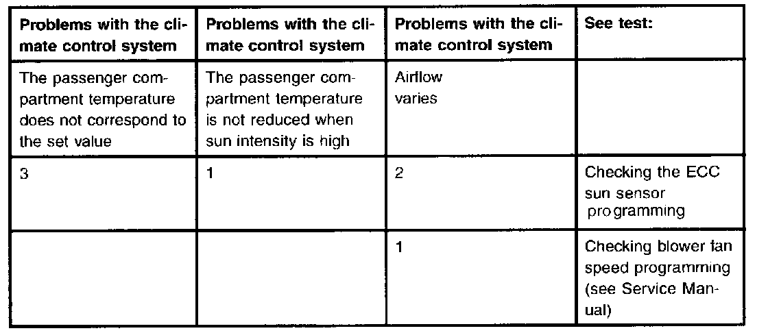 The intensity of the sun affects the temperature in the passenger compartment. To maintain an even temperature in the passenger compartment irrespective of the intensity of the sun, the ECC control module compensates the temperature setting depending on the signal from the sun sensor. The degree of sensitivity can be programmed so that the calculation of the ECC control module can be adapted. This allows some account to be taken of the driver's wishes for the climate settings in the car. The sensitivity can be set in 7 different steps. from -4 to +2.