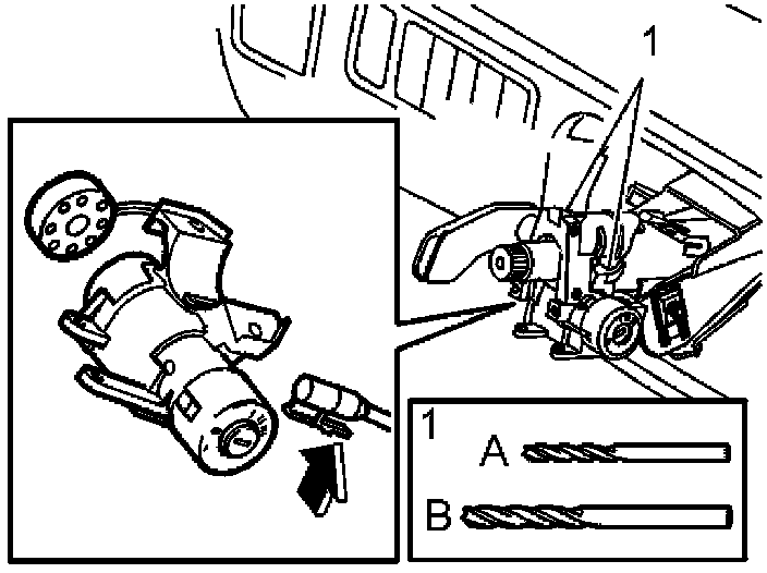 - Drill out the screw heads (1). Use an 8 mm drill bit (B).