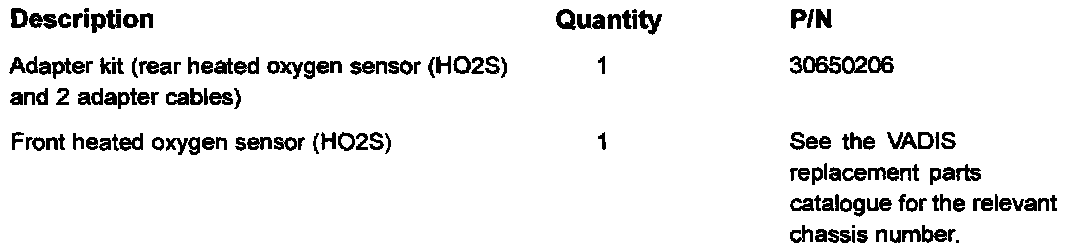 To prevent contamination from affecting the reference air for the heated oxygen sensors (HO2S) new routing has been developed for the sensor wiring. The following diagnostic trouble codes (DTCS) could be stored in the engine control module (ECM) due to harness contamination: 280A, 260A, 261A, 262A, 2A1A. Should no faults be detected for these DTCs after fault tracing according to VADIS, replace the effected heated oxygen sensors (HO2S) and install adaptor wiring harness The new adaptor wiring harness must also be installed for the remaining sensor.