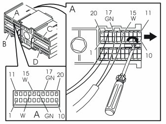 - Connect the white (W) cable to terminal 15 and the green (GN) cable to terminal 17.