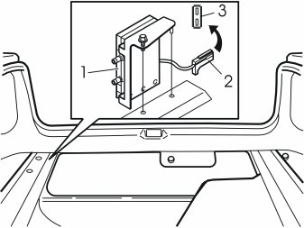 - Take the aerial amplifier (1) from the kit. Connect the cable (2) to the connector (3) for the aerial in the rear bumper by the right-hand tail lamp