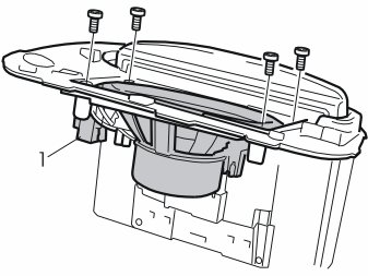 - Press the connector (1) for the centre loudspeaker into the bracket on the left-hand under side of the display screen bracket.