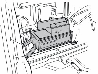 - Install the bracket with the DVD reader behind the wheel arch using the four screws (1) from the kit as illustrated. Tighten the screws. Tighten to 10 Nm (7 lbf. ft).