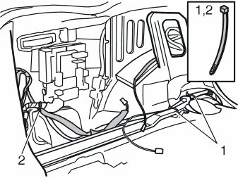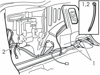 - Route the wiring (A in the kit illustration) for the display screen and the radio, and the loose cable for the display screen with the ten pin connectors (B in the kit illustration) for the radio socket between the air duct (1) and the stay (2). Ensure that the straight connector on the loose cable (B) is routed to the hole for the radio