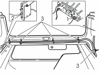 - Route the cable (3) with the blue connector. Position the cable at the tail lamp. The cable will be connected to the CD changer later.