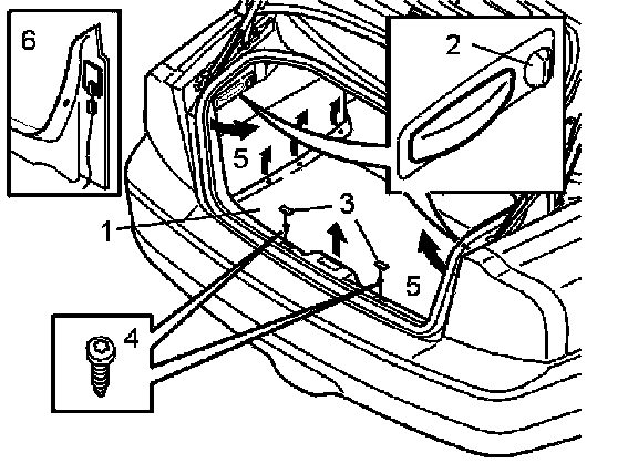 - Remove the two covers (3). Slacken off the two screws (4) from under the cover. Grip the outer edges of the panel (5). Pull the panel inwards towards the centre so that the clips release at the sides. Disconnect the connectors (6) for the cargo compartment lamps