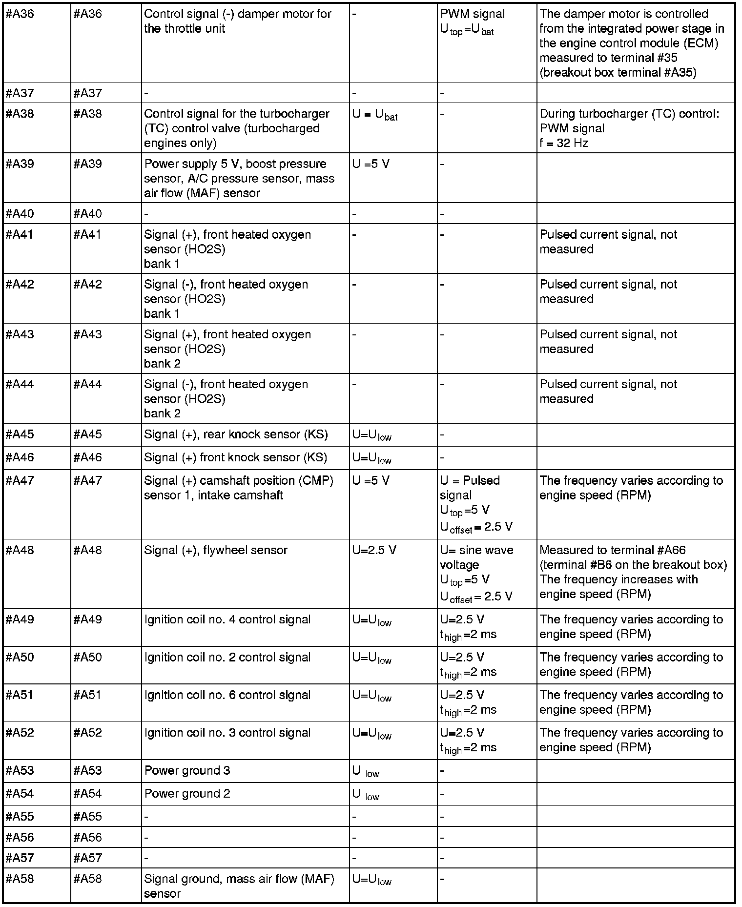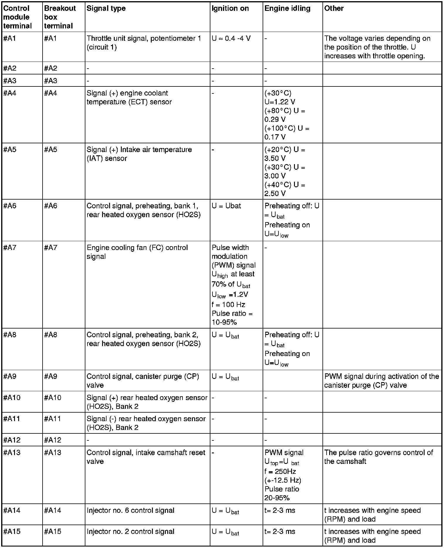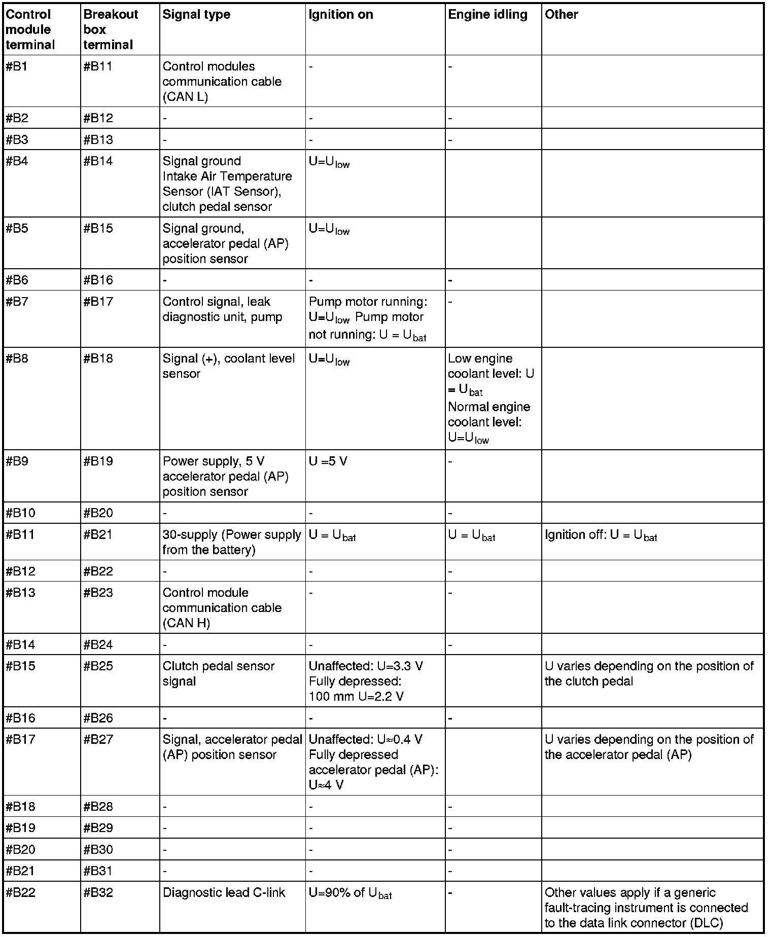 All values listed below are measured between the respective terminal in column 1 (control module terminal) and terminal B3 in column 2 (breakout box terminal) unless stated otherwise in column 6 (Other).