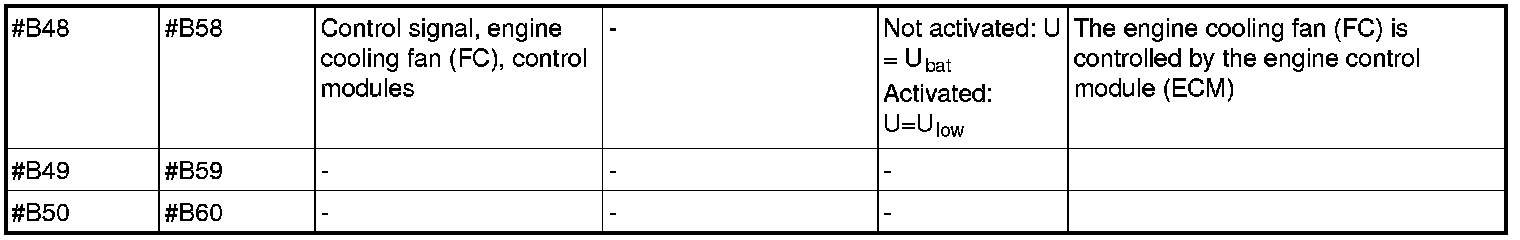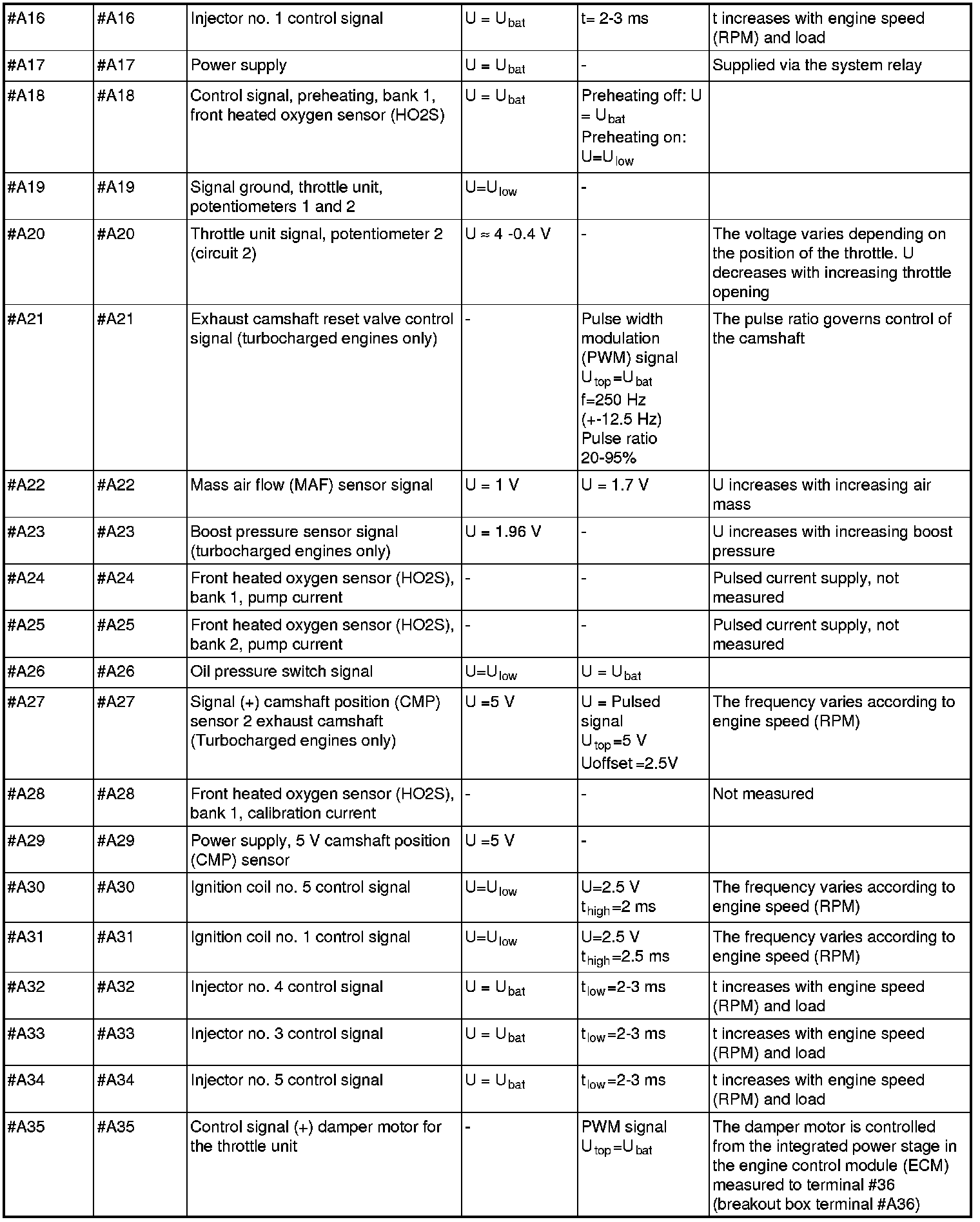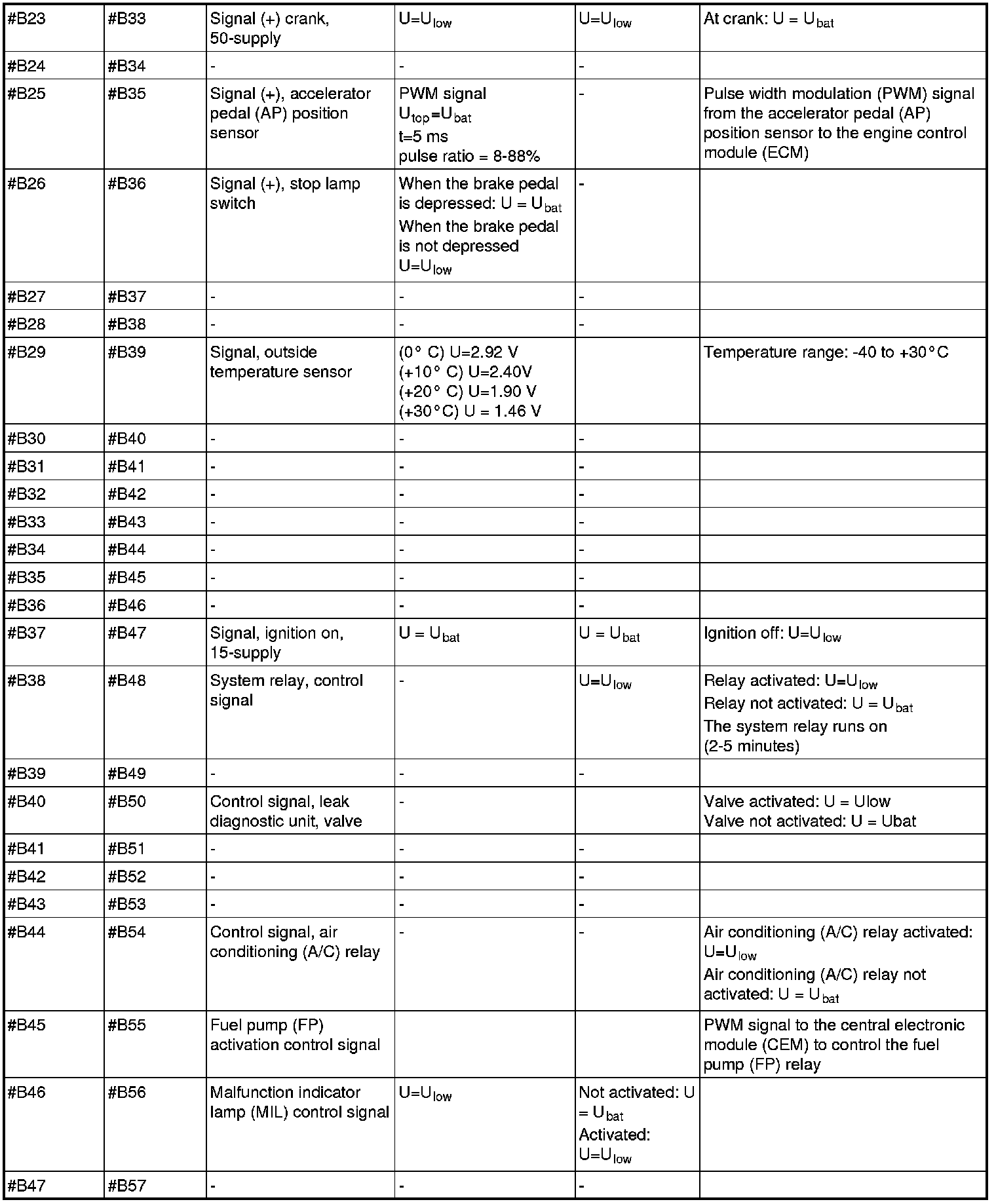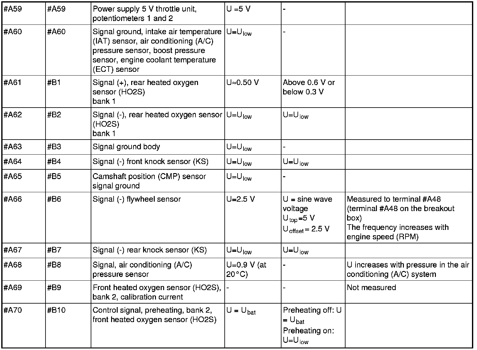 All values listed below are measured between the respective terminal in column 1 (control module terminal) and terminal B3 in column 2 (breakout box terminal) unless stated otherwise in column 6 (Other).
