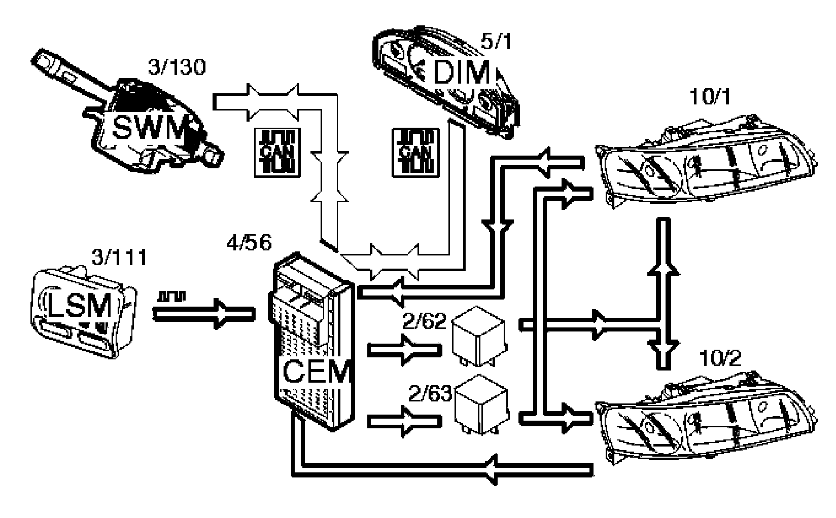 Headlamp range adjustment is controlled by the central electronic module (CEM) (4/56). The central electronic module (CEM) communicates with the light switch module (LSM) (3/111) using serial communication.
