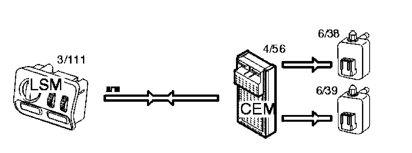 The lamp switch module (LSM) transmits data using serial communication to the central electronic module (CEM) (4/56) to activate the lamps.