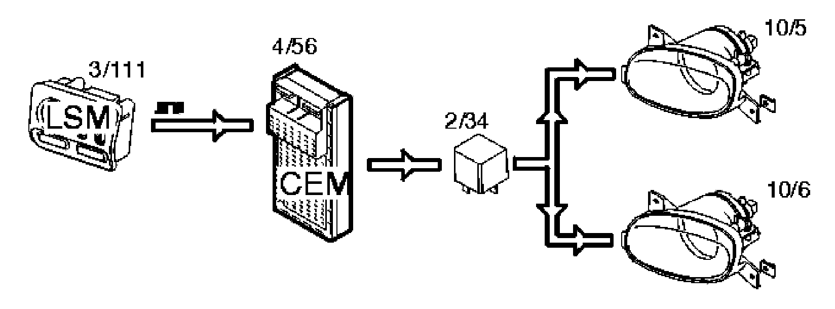 The front fog lamps (10/5-6) are activated by pressing the button for the front fog lamps in the light switch module (LSM) (3/111). The light switch module (LSM) transmits data to the central electronic module (CEM) (4/56) to light the lamps. The central electronic module (CEM) activates the relay (2/34) and the bulbs are supplied with power via the relay.