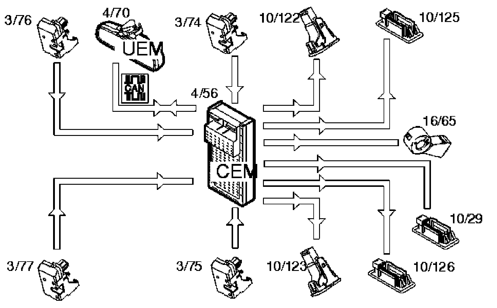 The courtesy lighting (10/122-123, 10/125-126), keyhole (16/65) and glove compartment lighting (10/29) are controlled via the central electronic module (CEM) (4/56). All other interior lighting is controlled by the upper electronic module (UEM) (4/70). The central electronic module (CEM) powers the lamps which it controls directly.