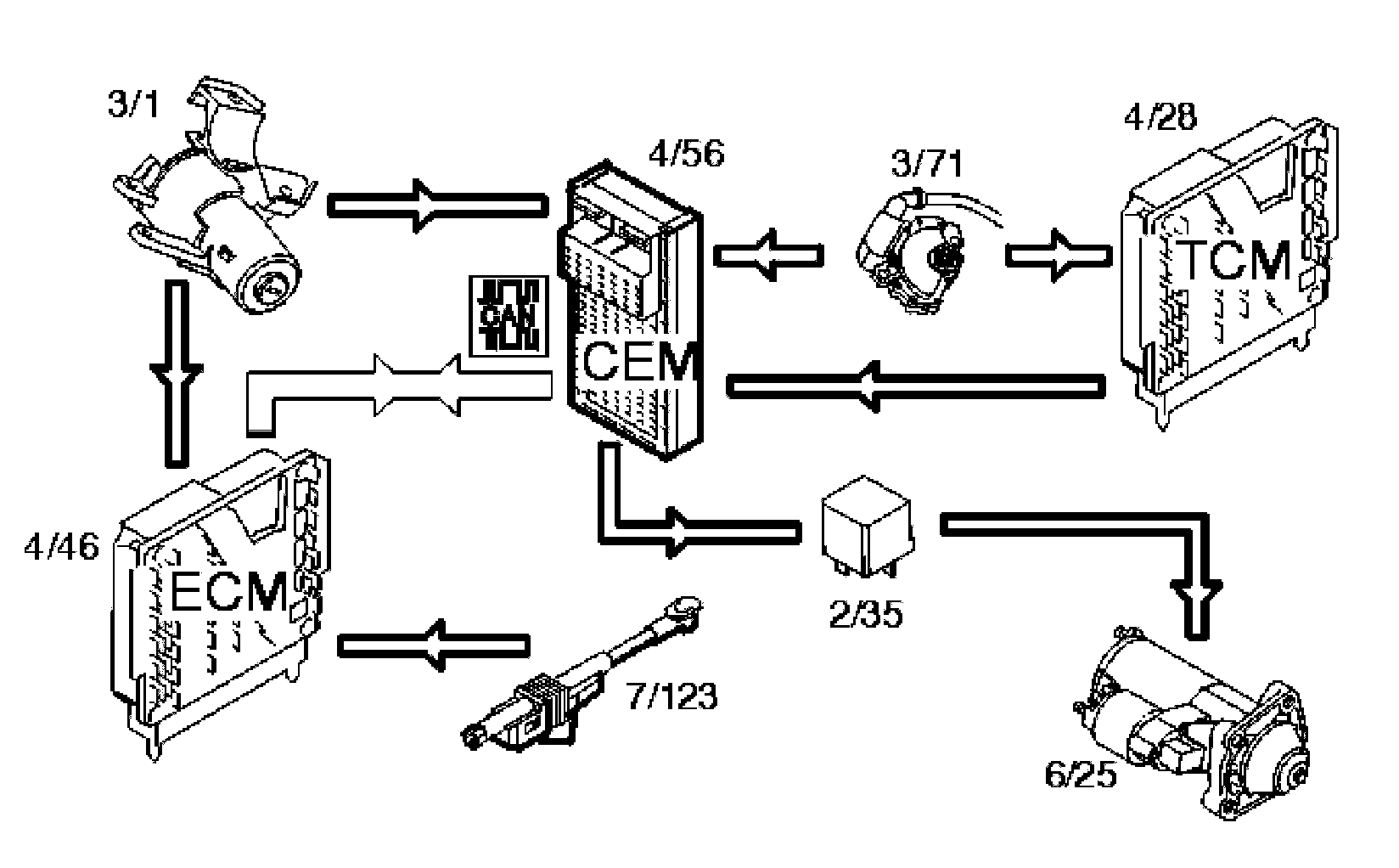 - For transmissions without clutch interlock, the central electronic module (CEM) (4/56) activates relay 2/35 and powers the solenoid in the starter motor (6/25).