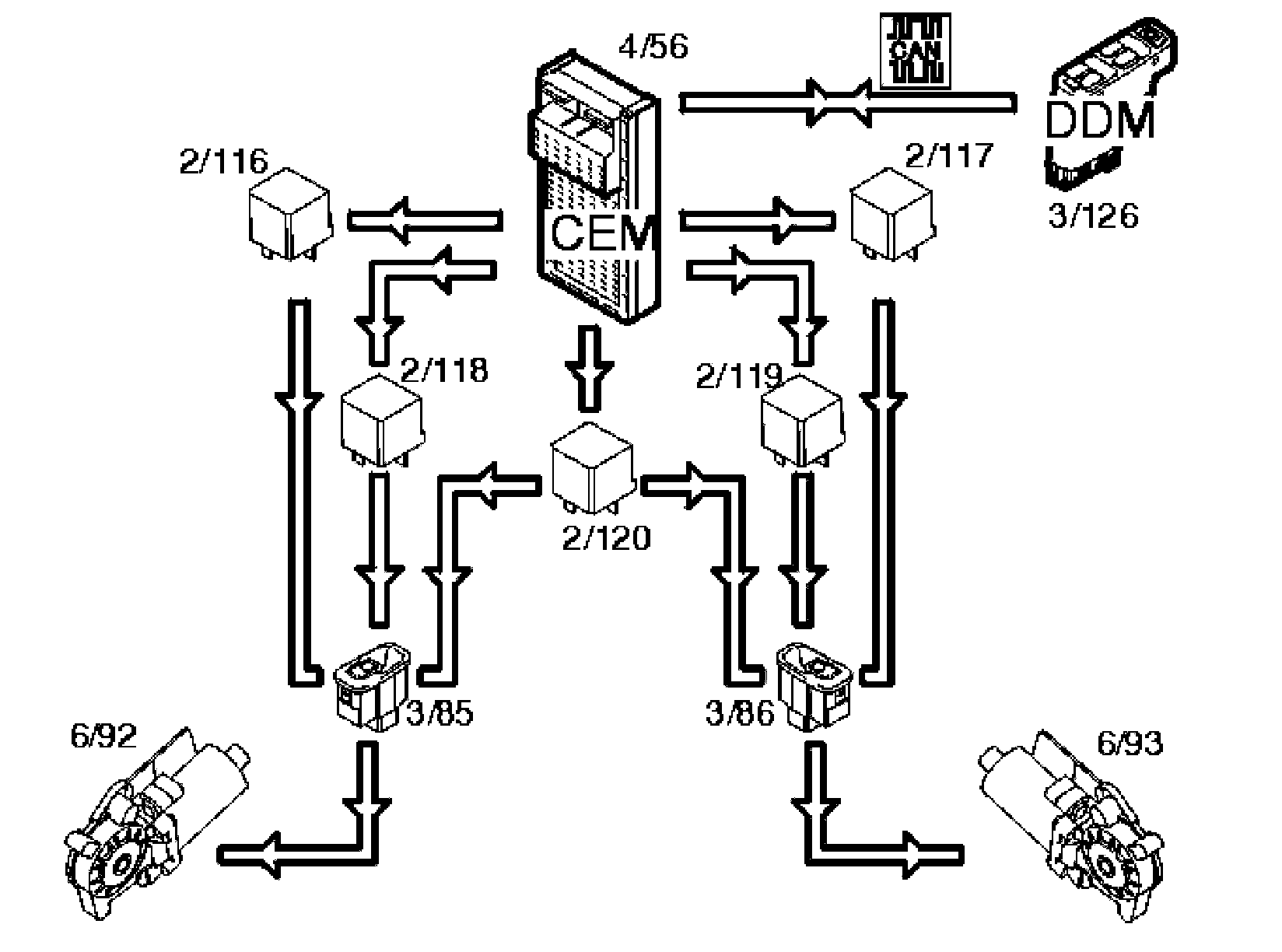 When the window lift mechanisms are operated from the driver's position, data is transmitted from the driver's door module (3/126) via the control area network (CAN) to the central electronic module (CEM) which transmits a signal to the correct relay.