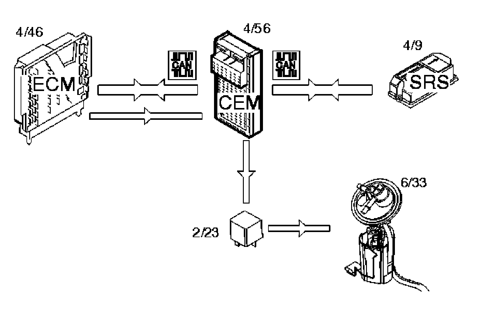 The central electronic module (CEM) (4/56) receives a request from the engine control module (ECM) (4/46) via the control area network (CAN) to start the fuel pump (FP) (6/33). The central electronic module (CEM) then activates the relay (2/23) which supplies the fuel pump with power.