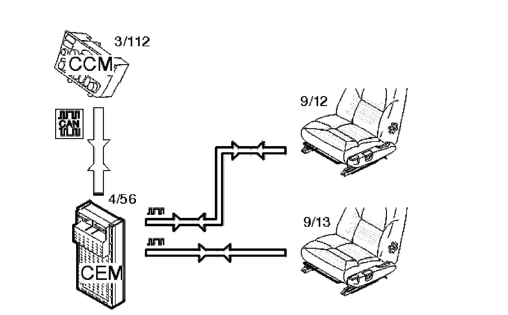 The climate control module (CCM) transmits information via the control area network (CAN) to the central electronic module (CEM) (4/56) to activate the seat heaters. The central electronic module (CEM) sends back a signal to the climate control module (CCM) to light the LED in the button. The central electronic module (CEM) compares the signal from the climate control module (CCM) with the programmed value for high/low temperature and transmits a pulsed signal to the control module for the seat heater (9/12-13) about the requested temperature. The number of pulses determines the power at which the control module will operate the seat heater. The control module also compares the value from the thermistor so that it can detect faults in the heater pad.