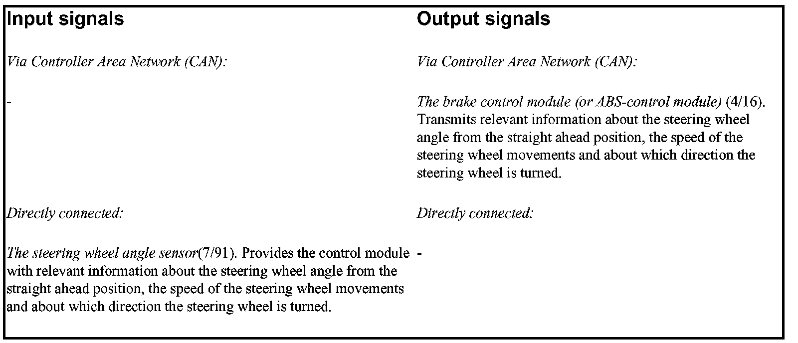 The table above summarizes input and output signals to and from the Steering wheel angle sensor control module. The signal types are divided into directly connected signals, serial communication and Controller area network (CAN) communication.