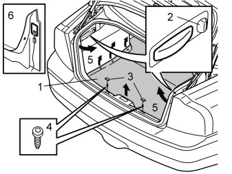 - Remove the two covers (3). Slacken off the two screws (4) from under the cover. Grip the outer edges of the panel (5). Pull the panel inwards towards the centre so that the clips release at the sides. Disconnect the connectors (6) for the cargo compartment lamps