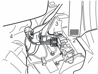 - Connect the connector (4) from the routed cable harness to the disconnected connector (1). Wrap foam tape (from the kit) around them