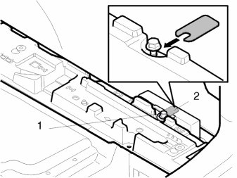 - Connect the black ground lead (1) to the front ground terminal (2). Use the existing ground terminal. Tighten to approximately 10 Nm (8 lbf.ft.)