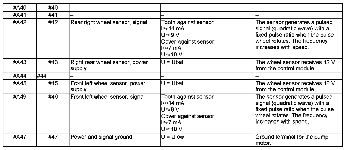All values given are between the relevant terminal in column 1 and terminal # A16 or # A47 (ground), unless otherwise indicated in brackets.