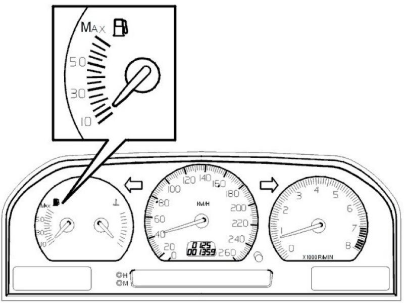 Note! In order for the new ECC control module to function correctly, the speed signal must be programmed. From production week 832 inclusive, the ECC control module has been updated with a new function for the programming of the speed signal from the combined instrument panel. This is because the functionality of the combined instrument panel has been changed. Previously the combined instrument panel had two output signals; a 12 pulsed and a 48 pulsed signal. The ECC control module was connected to the 48 pulse signal. The new combined instrument panel will only have a 12 pulsed speed signal. Therefore the ECC control module is connected to the 12 pulsed signal. The new ECC control modules replace the older versions and can be installed in both new and older cars. To obtain the correct functionality, the new ECC control module must be programmed for the correct type of speed signal. The new combined instrument panel has the text "Max" instead of a digit at the maximum fuel level in the fuel gauge. On older combined instrument panels the ECC control module must be programmed for 48 pulses. On new combined instrument panels the ECC control module must be programmed for 12 pulses.