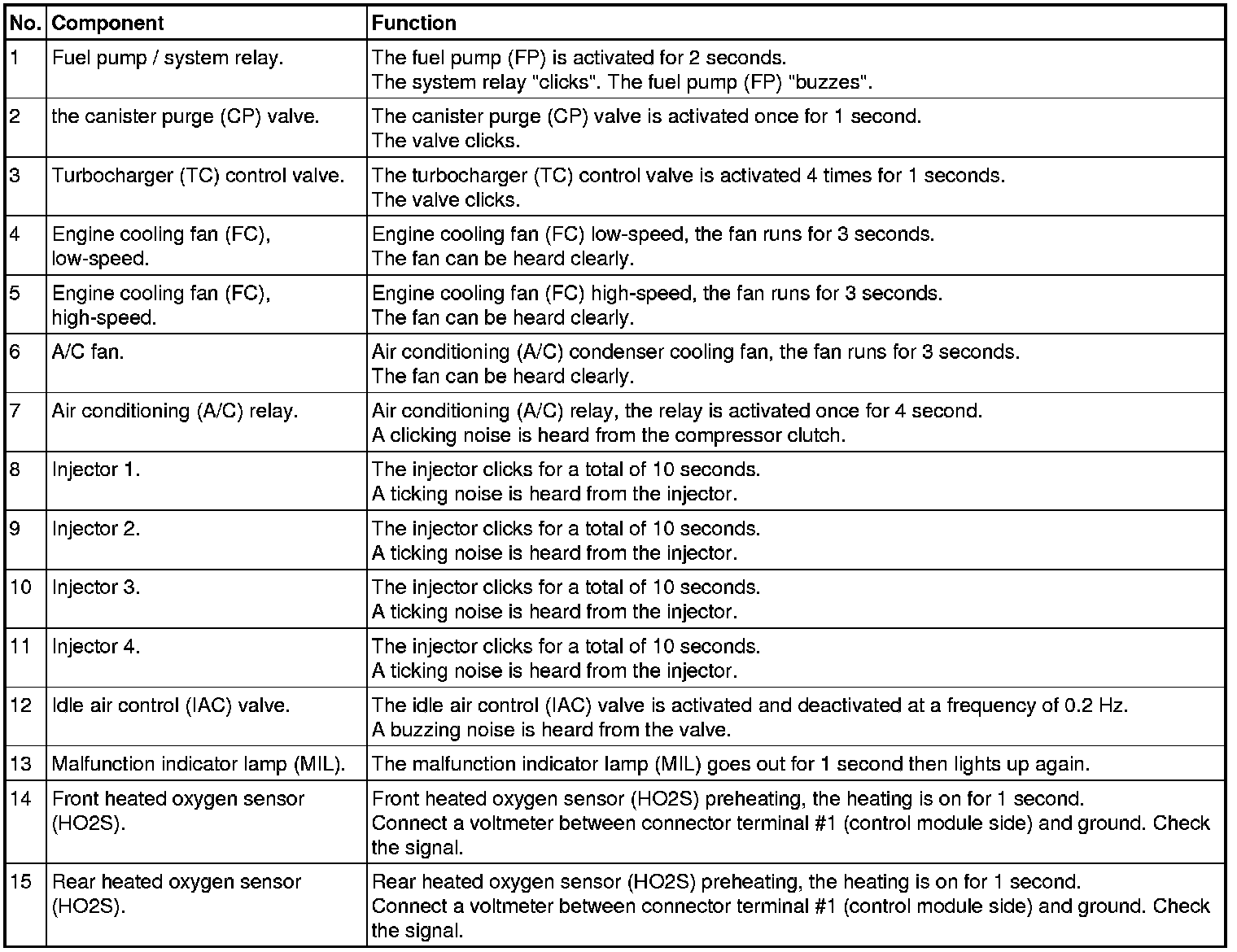 Many of these activations will cause the fuel pump (FP) to start. This is because the system relay is activated to supply the components with power.