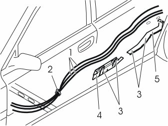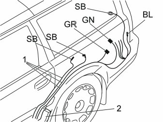 - Route the wiring (1) under the carpet along the left-hand side of the car to the rear door.