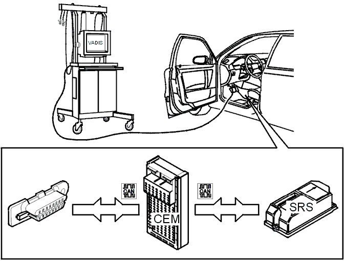 The on-board diagnostic (OBD) system for the SRS continually diagnoses the function of SRS system components and stores any diagnostic trouble codes (DTCs). However, the diagnostics for the two front seat belt buckles are carried out by the central electronic module (CEM) which also stores any diagnostic trouble codes (DTC) for them. If a fault is registered for longer than 5 minutes, the central electronic module (CEM) transmits the diagnostic trouble code (DTC) to the supplemental restraint system module (SRS). The supplemental restraint system module (SRS) then stores diagnostic trouble code(s) (DTC) for the front seat belt buckles. The diagnostic trouble codes (DTCs) can then be read off via VIDA. The principle behind VIDA information presentation is the same as for other on-board diagnostic (OBD) systems.