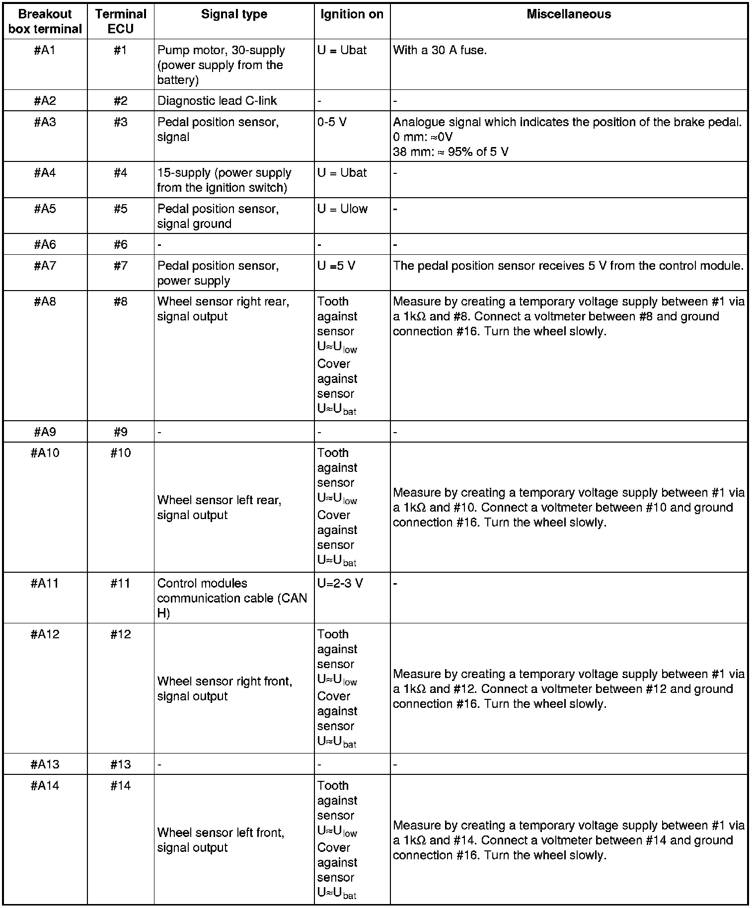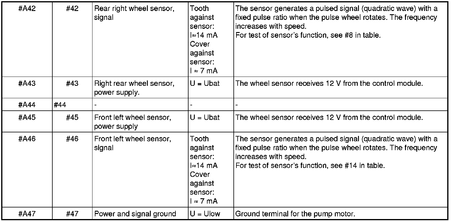 All values given are between the relevant terminal in column 1 and terminal #A16 or #A47 (ground), unless otherwise indicated in brackets.
