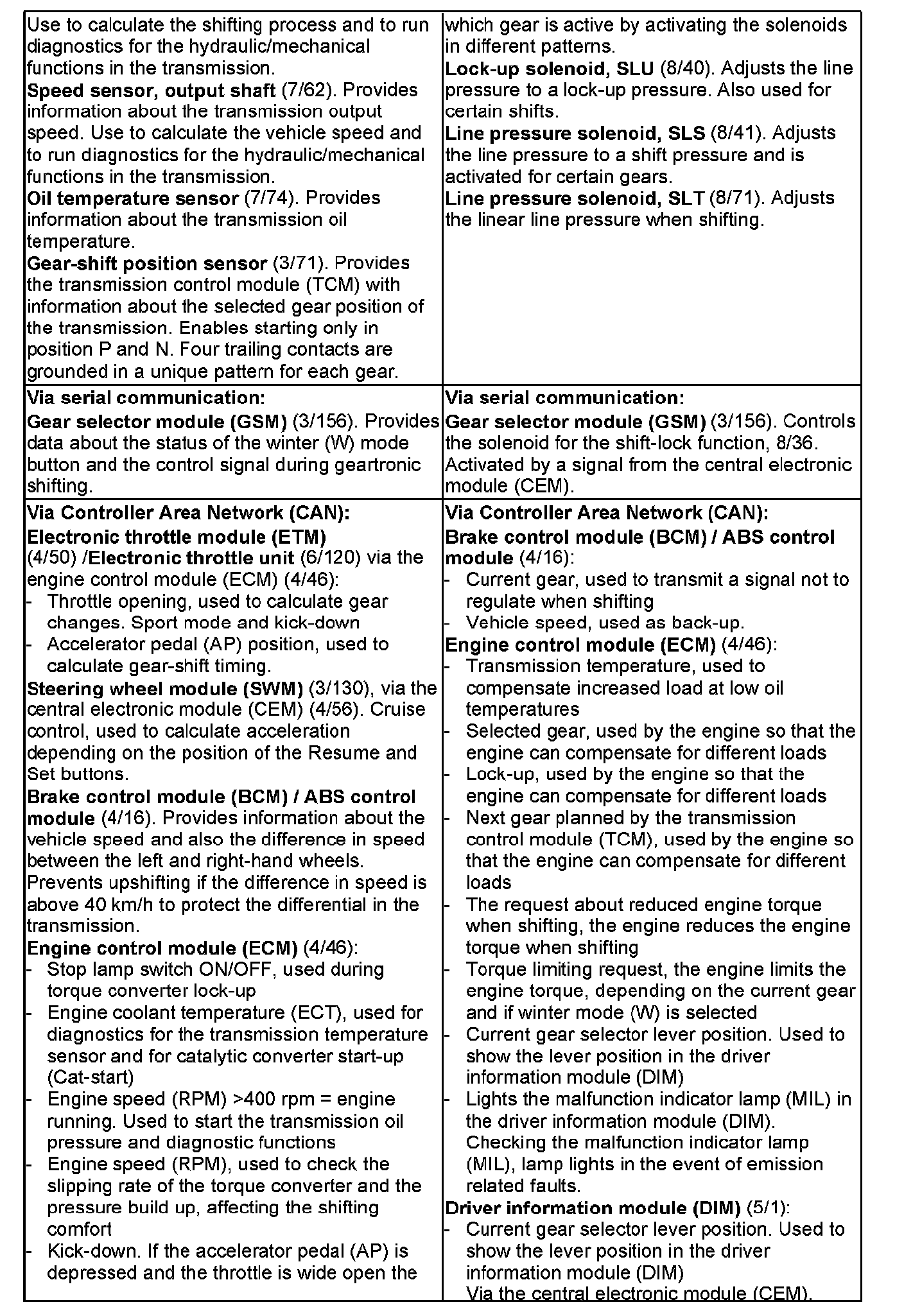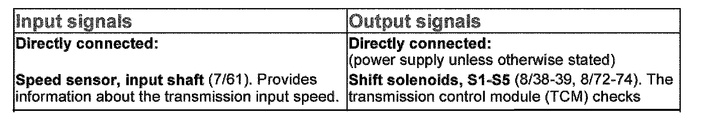 The table summarizes the input signals to and output signals from the transmission control module (TCM). The signal types are divided into directly connected signals, serial communication and Controller area network (CAN) communication. The following illustration displays the same information with the Volvo component designations.