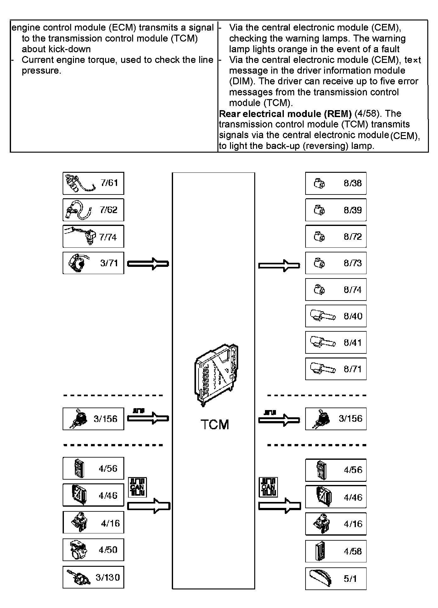 The transmission control module (TCM) receives information about the desired gear position and driving mode from the driver. In conjunction with the signals from a number of sensors in the transmission and the engine control system, unlike with a purely hydraulically controlled transmission, this allows the control module to calculate the optimal shifting points and engagement of lock-up. The control module allows for small changes in the operating conditions and adapts the various transmission functions to ensure that the correct gear is always selected in relation to the driving mode selected by the driver.