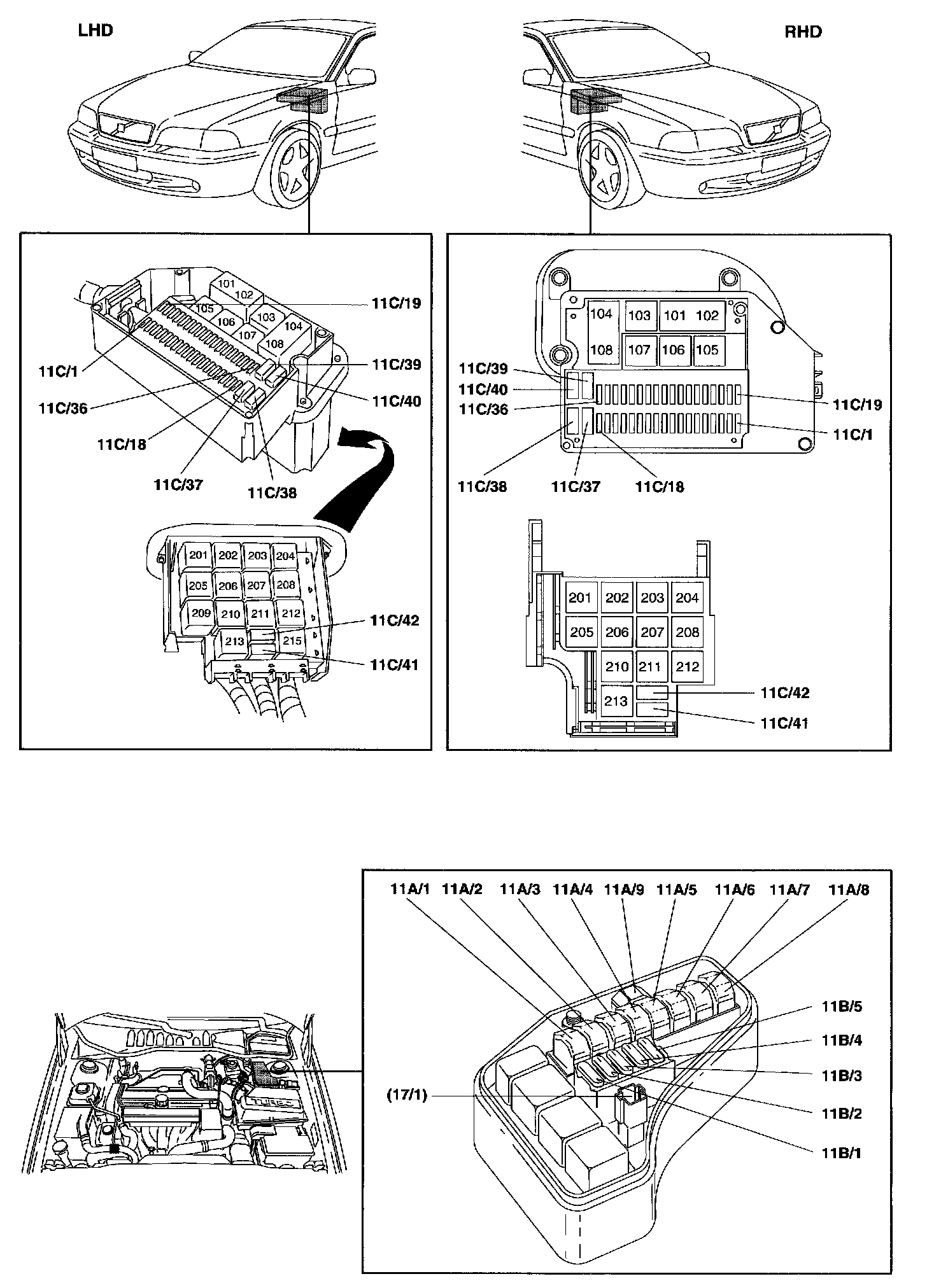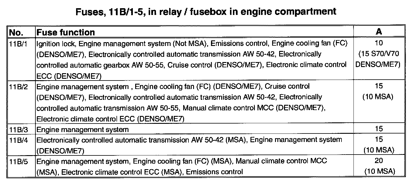 Fuses, 11B/1-5, In relay / fusebox in engine compartment: