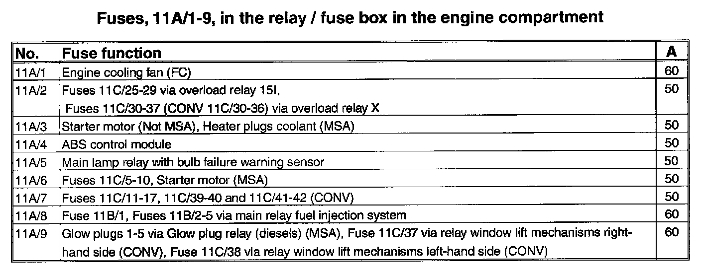 Fuses, 11A/1-9, In the relay / fuse box in the engine compartment: