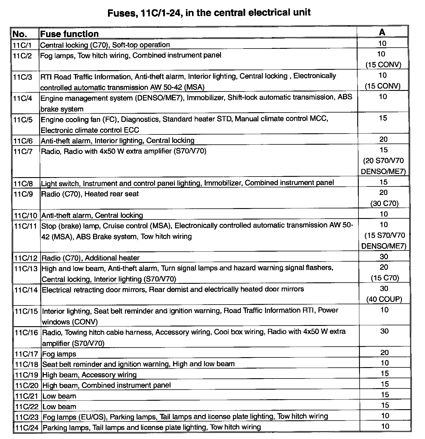 Fuses, 11C/1-24, In the central electrical unit: