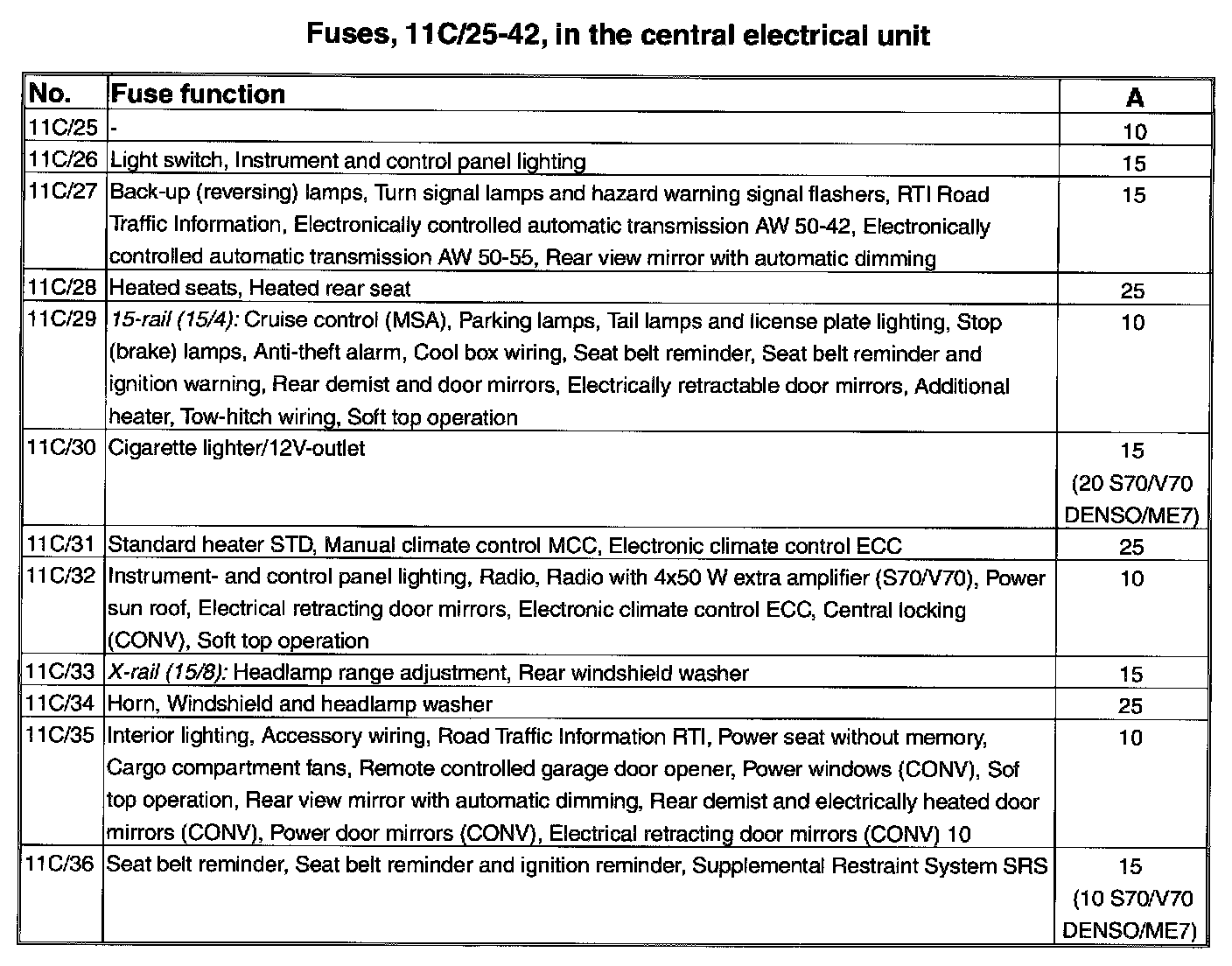 Fuses, 11C/25-36, In the central electrical unit: