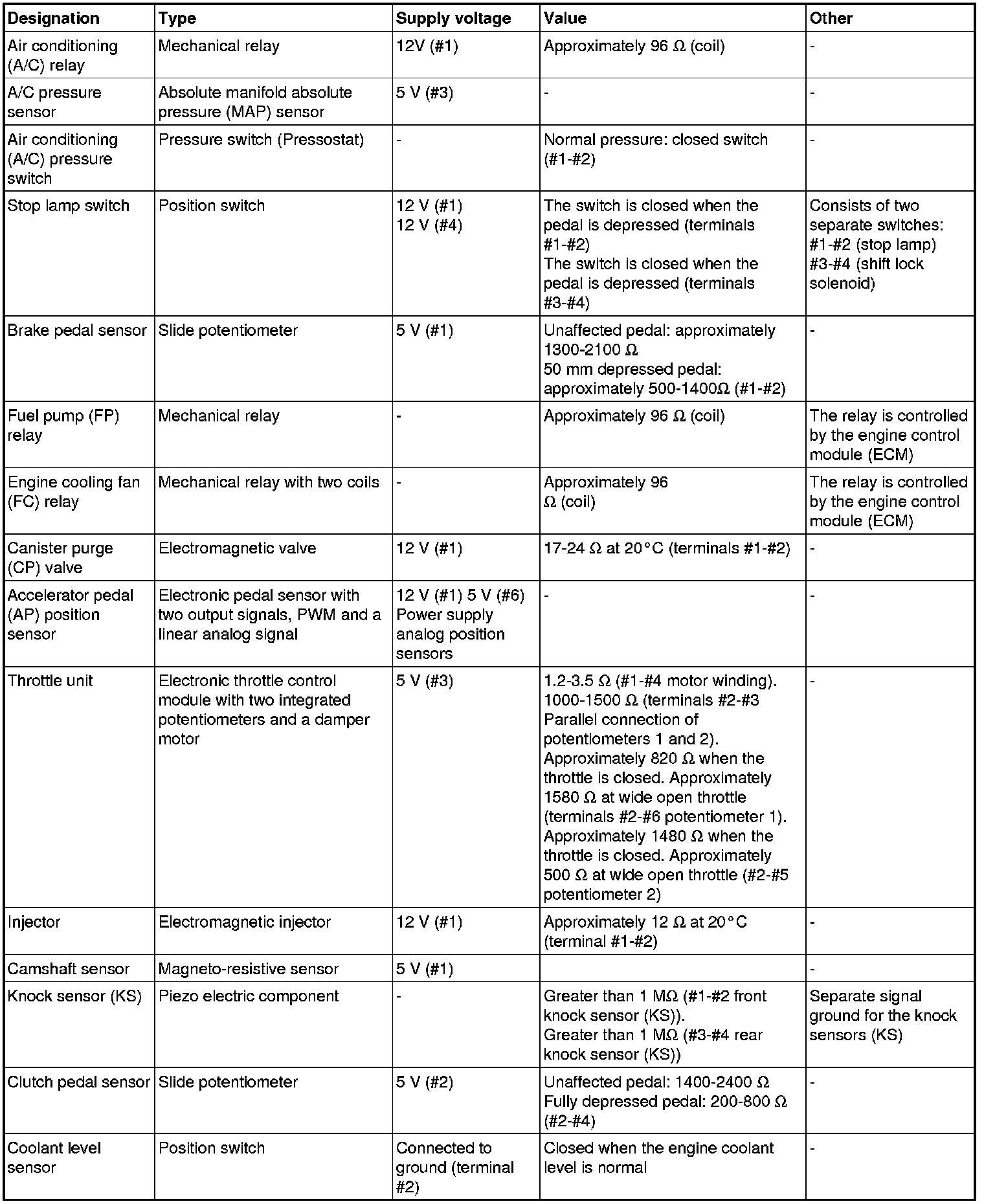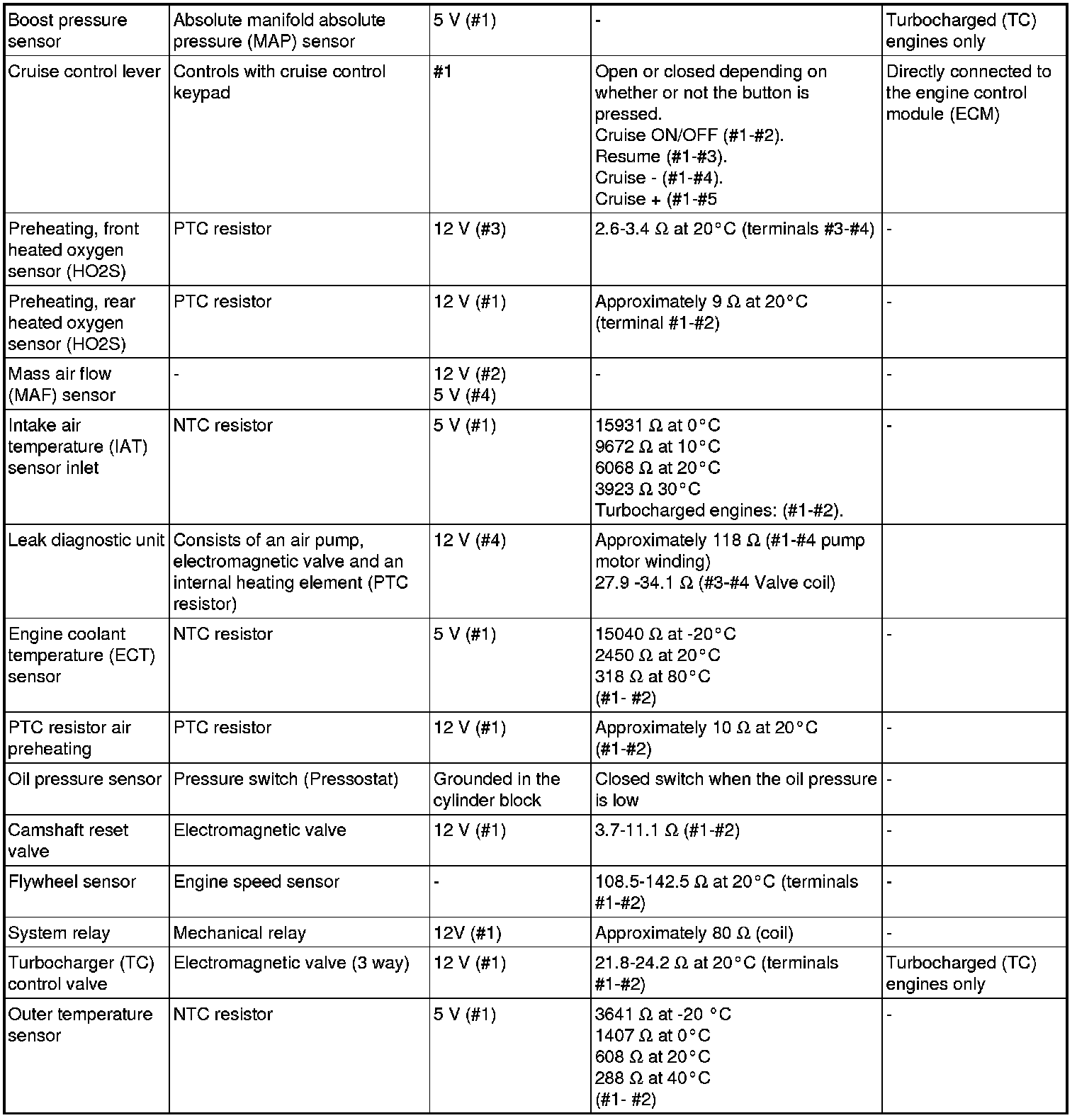 The component specification gives the value of the component when the connector is disconnected. Where no value is given, it is not possible to measure a relevant value at the component.