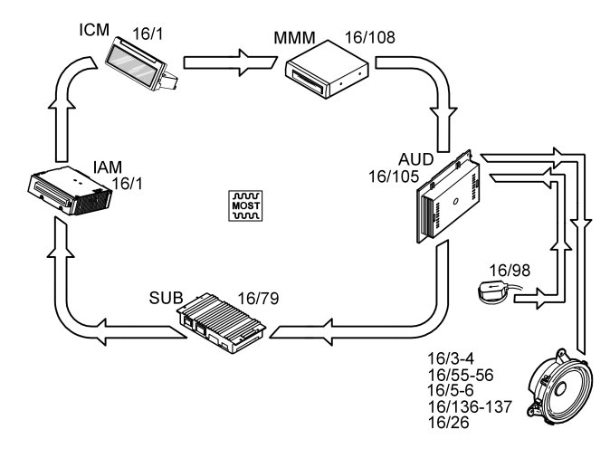 When sound compensation is required, the infotainment control module (ICM) transmits sound compensation signals via the MOST network to the audio module (AUD).