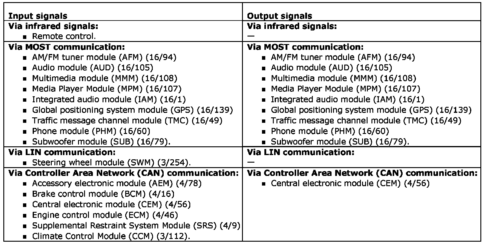 The table below summarizes the input signals to and output signals from the infotainment control module (ICM). The signal types are divided into infrared signals (IR), MOST communication, LIN communication and CAN communication. The illustration below displays the same information with the Volvo component designations.