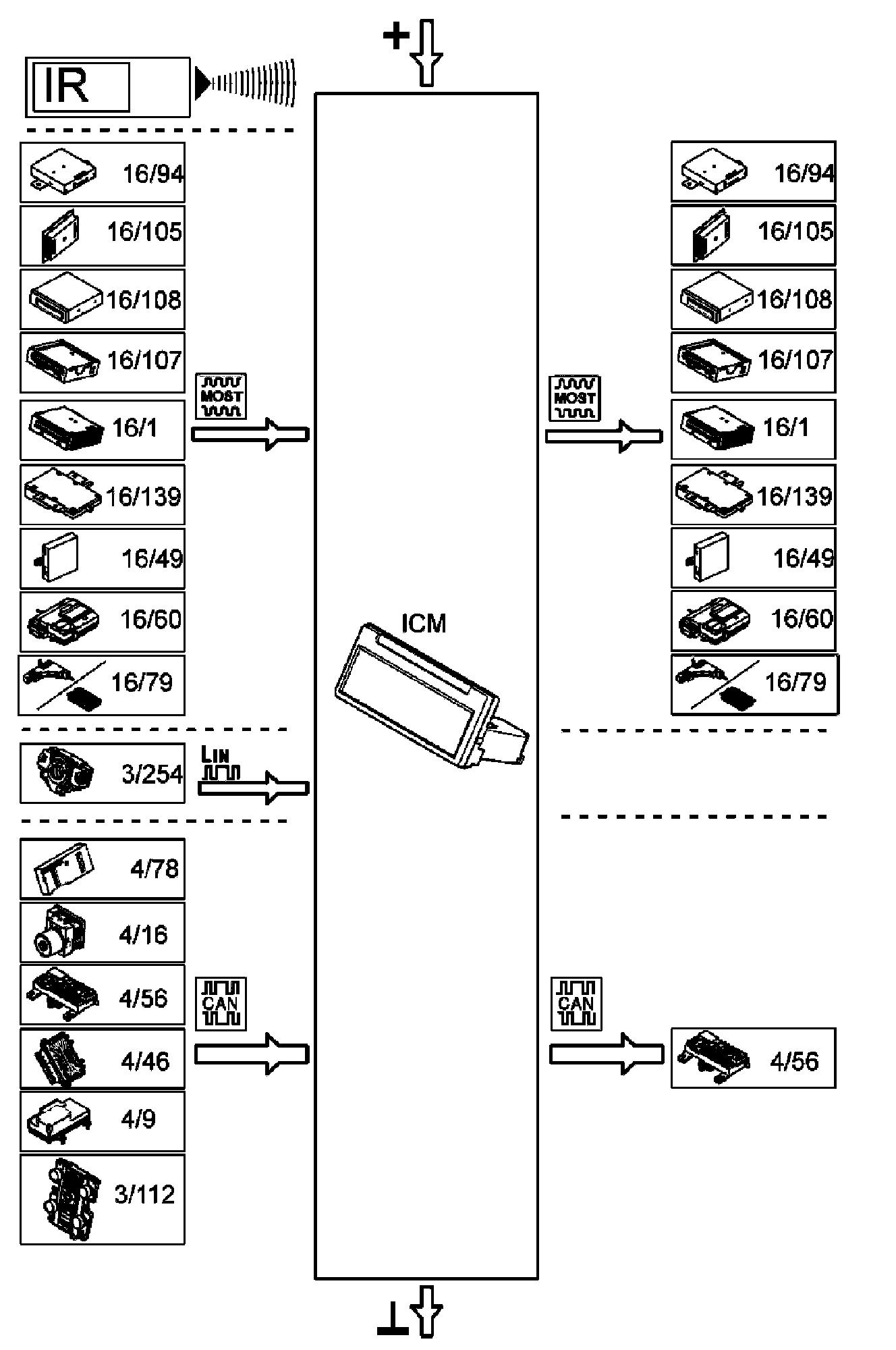 The infotainment control module (ICM) acts as a gateway between the CAN and MOST networks. It also acts as the master control module in the MOST network and checks the other control modules.