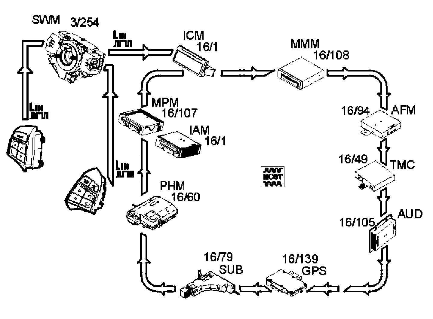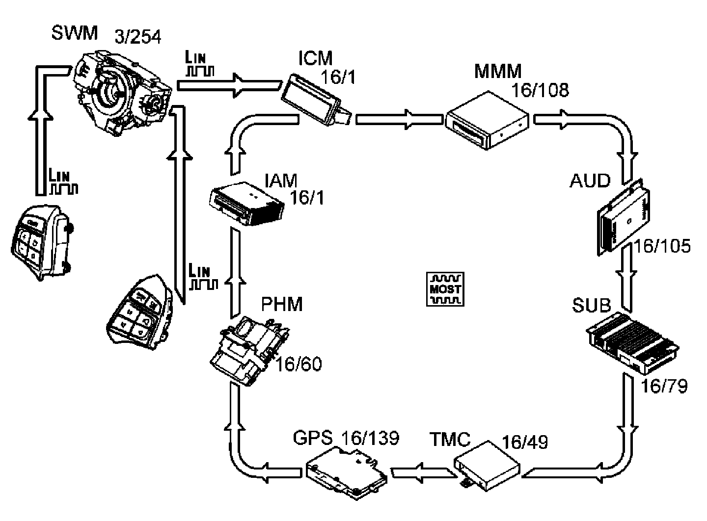The signals from the steering wheel buttons are transmitted to the steering wheel module (SWM) with LIN communication. The steering wheel module (SWM) transmits the signals on to the Infotainment Control Module (ICM) (16/1) using LIN communication. The infotainment control module (ICM) in turn transmits the signals on to the affected control module on the MOST network.