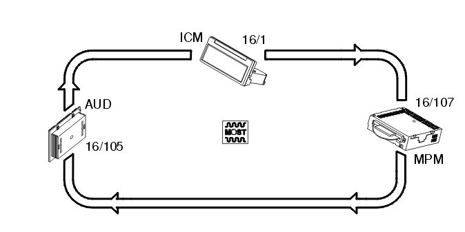 The media player module (MPM) (16/107) receives input signals from the infotainment control module (ICM) (16/1) via the MOST network. The signals indicate when the user has pressed the Play, Stop or Eject buttons for example.