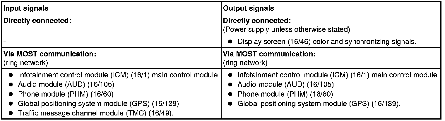 The table below summarizes the input signals to and output signals from the multimedia module (MMM). The signal types are divided into directly connected signals and MOST communication. The illustration below displays the same information with the Volvo component designations.