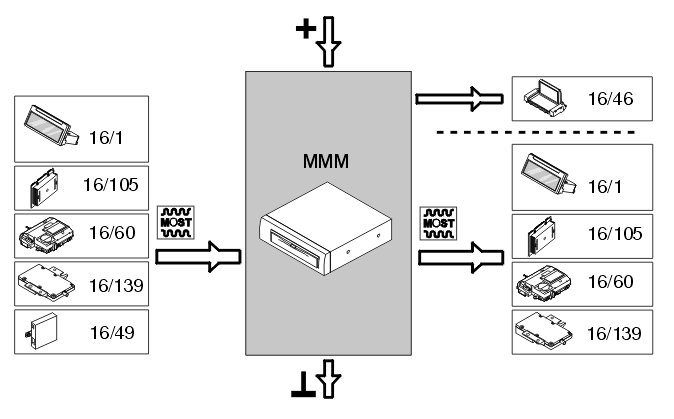 Only the display screen is directly connected to the multimedia module (MMM). The DVD player is integrated in the multimedia module (MMM). The functions from other control modules are via the MOST network, but are managed using the multimedia module (MMM). The system is not compatible with music or film CD or DVDs.