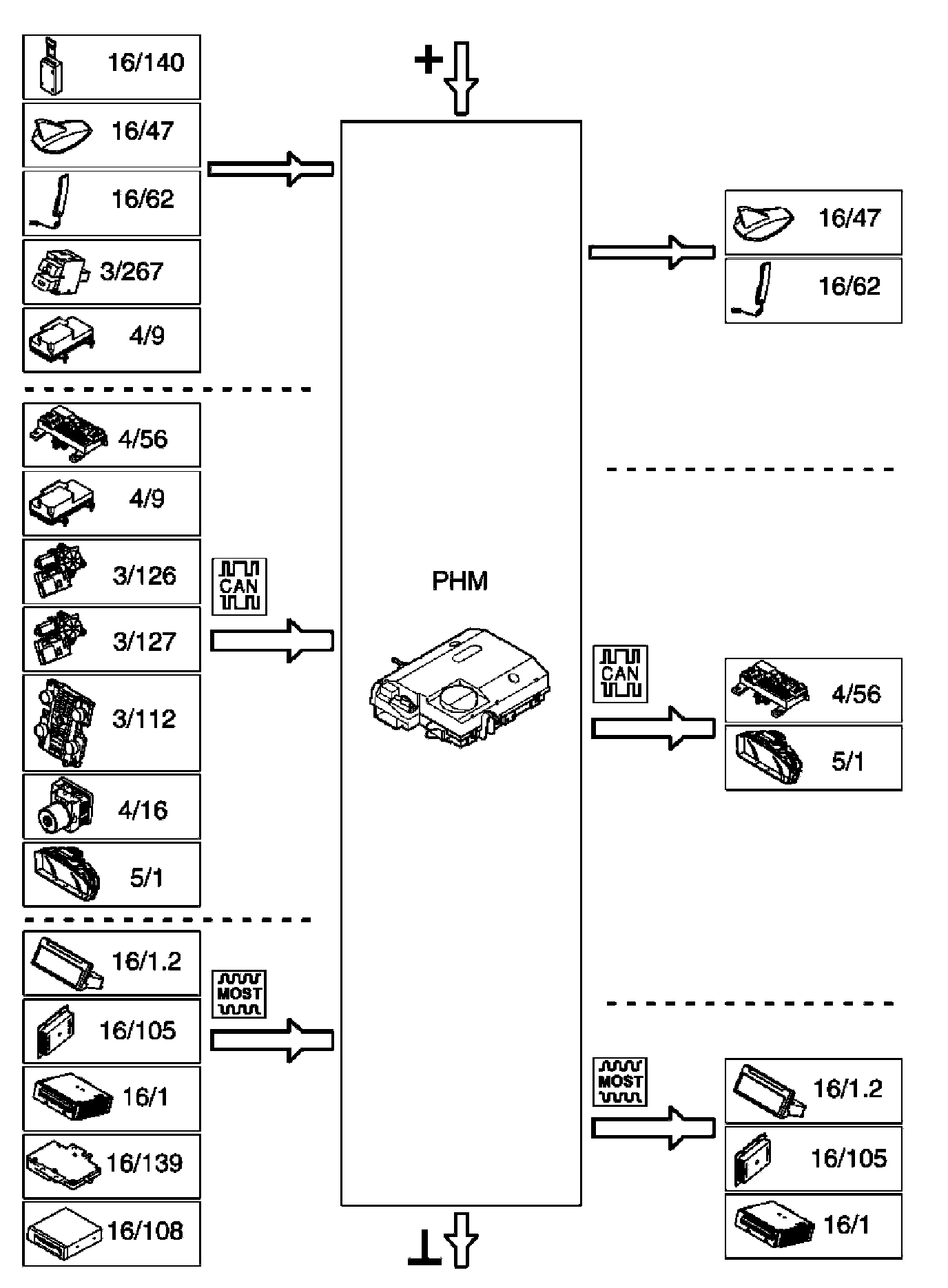 Phone module (PHM) (16/60) does not have its own keypad for menu management. It is controlled either from the keypad on the climate control module (CCM) (3/112) or using the buttons on the steering wheel. The climate control module (CCM) transmits signals for menu management to the infotainment control module (ICM) (16/1.2) via the controller area network (CAN). The infotainment control module (ICM) then sends the signals on to the phone module (PHM) via the MOST network.