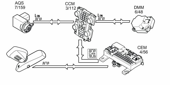 The air quality sensor (AQS) (7/159) transmits a signal to the climate control module (CCM) if it detects raised concentrations of pollutants in the outside air. When this occurs, the climate control module (CCM) transmits a signal to the damper motor for recirculation (6/48) to close the fresh air damper and to use recirculated air.