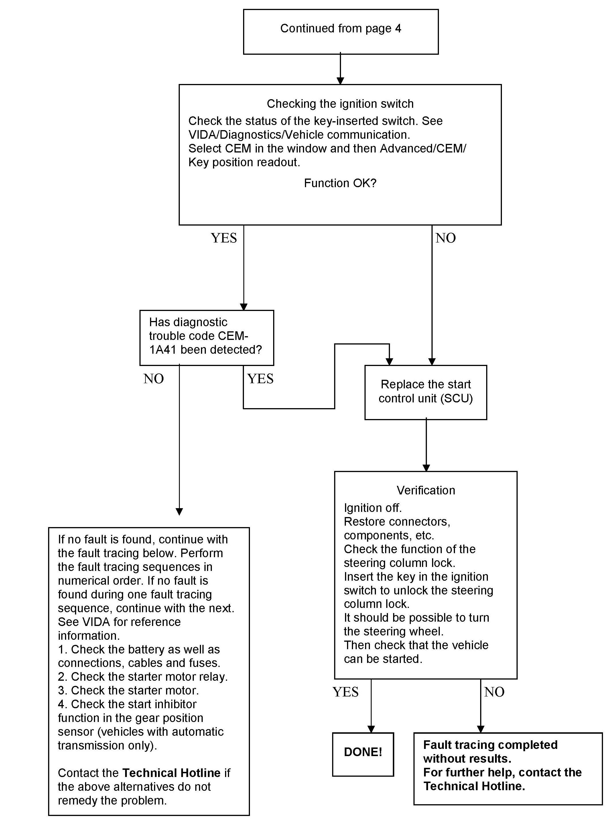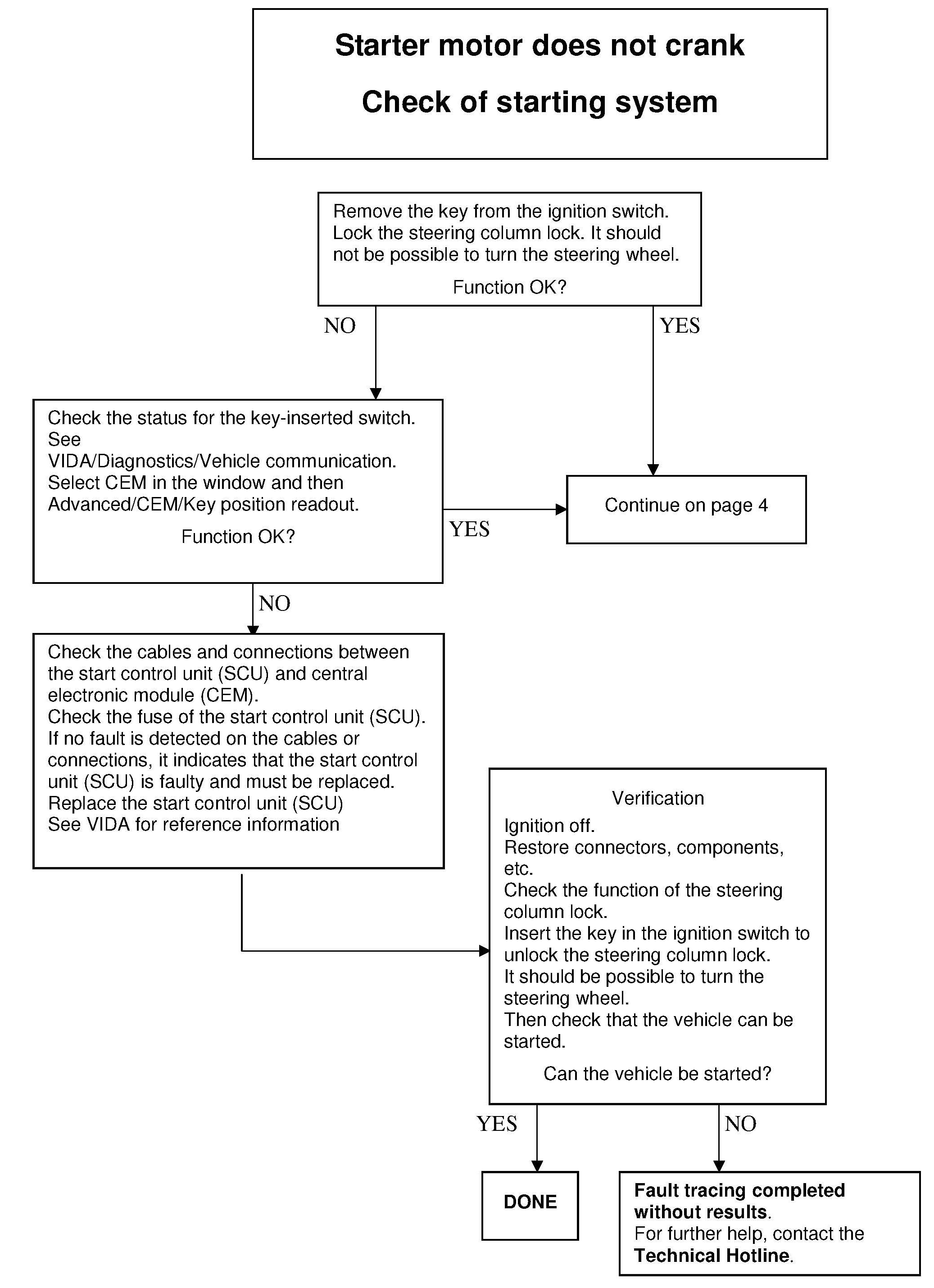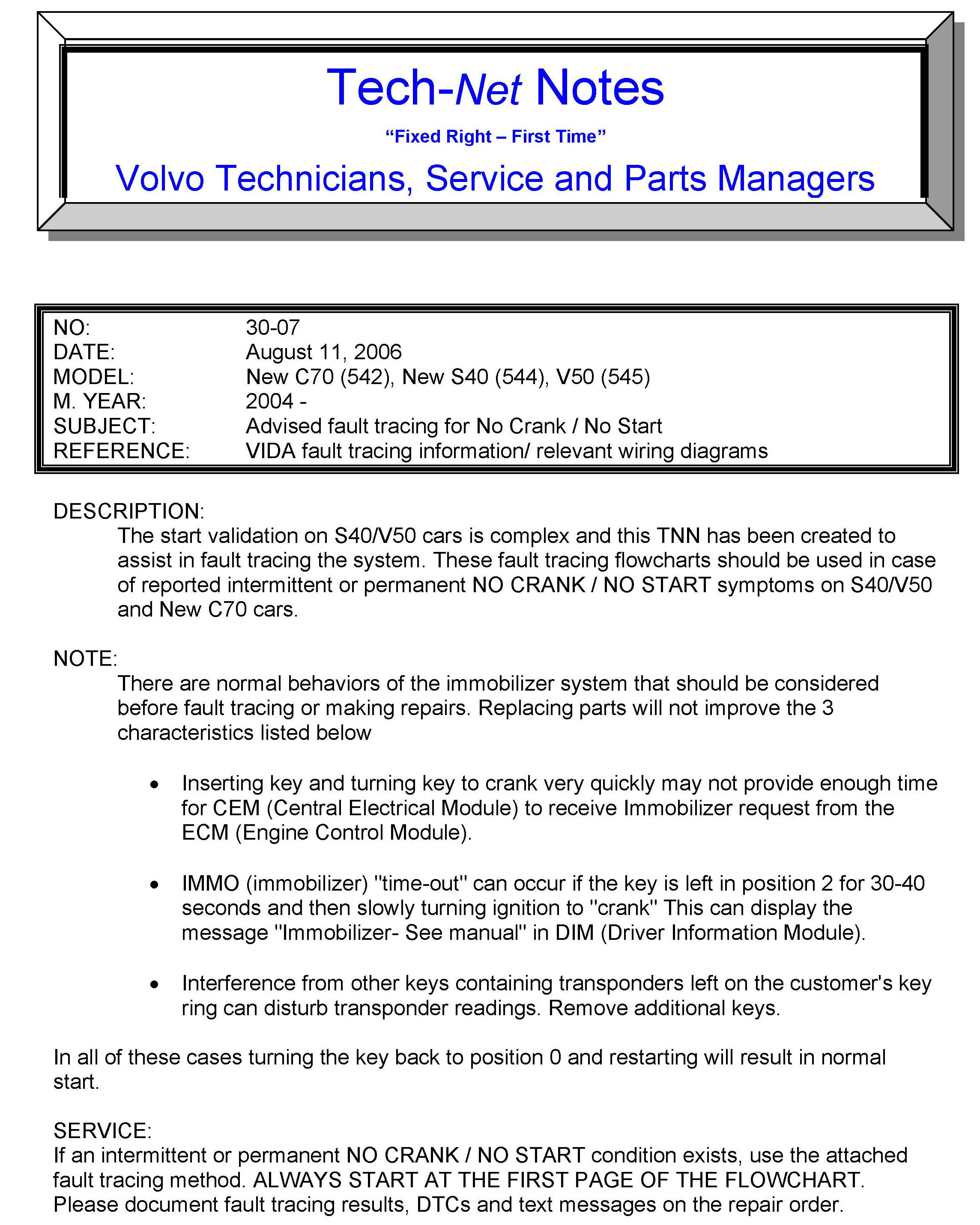 The start validation on S401V50 cars is complex and this TNN has been created to assist in fault tracing the system. These fault tracing flowcharts should be used in case of reported intermittent or permanent NO CRANK / NO START symptoms on 5401V50 and New C70 cars.
