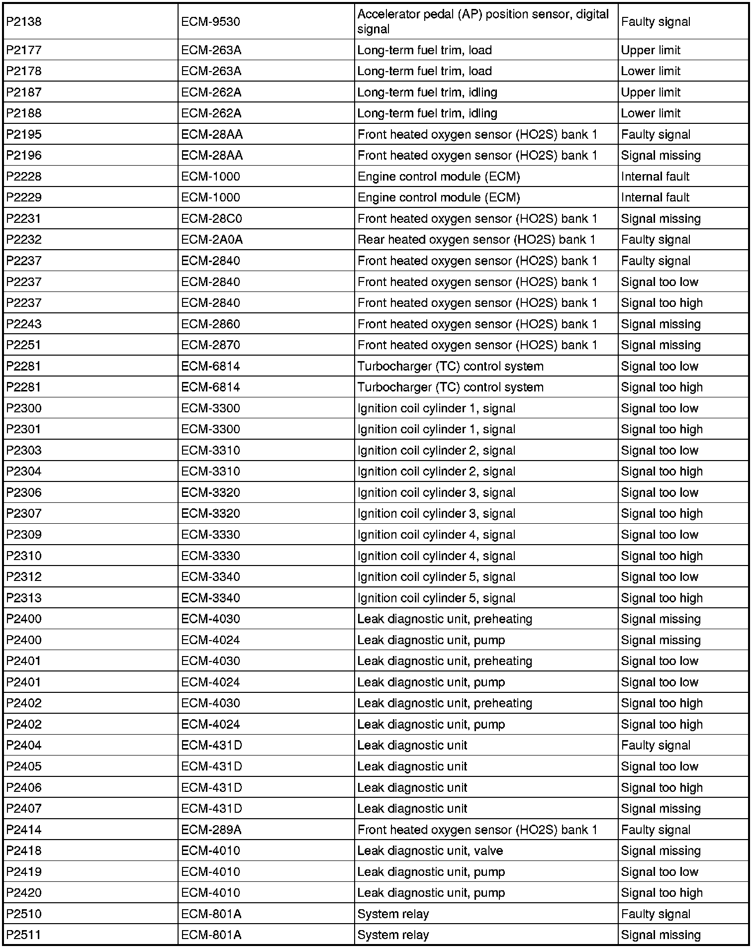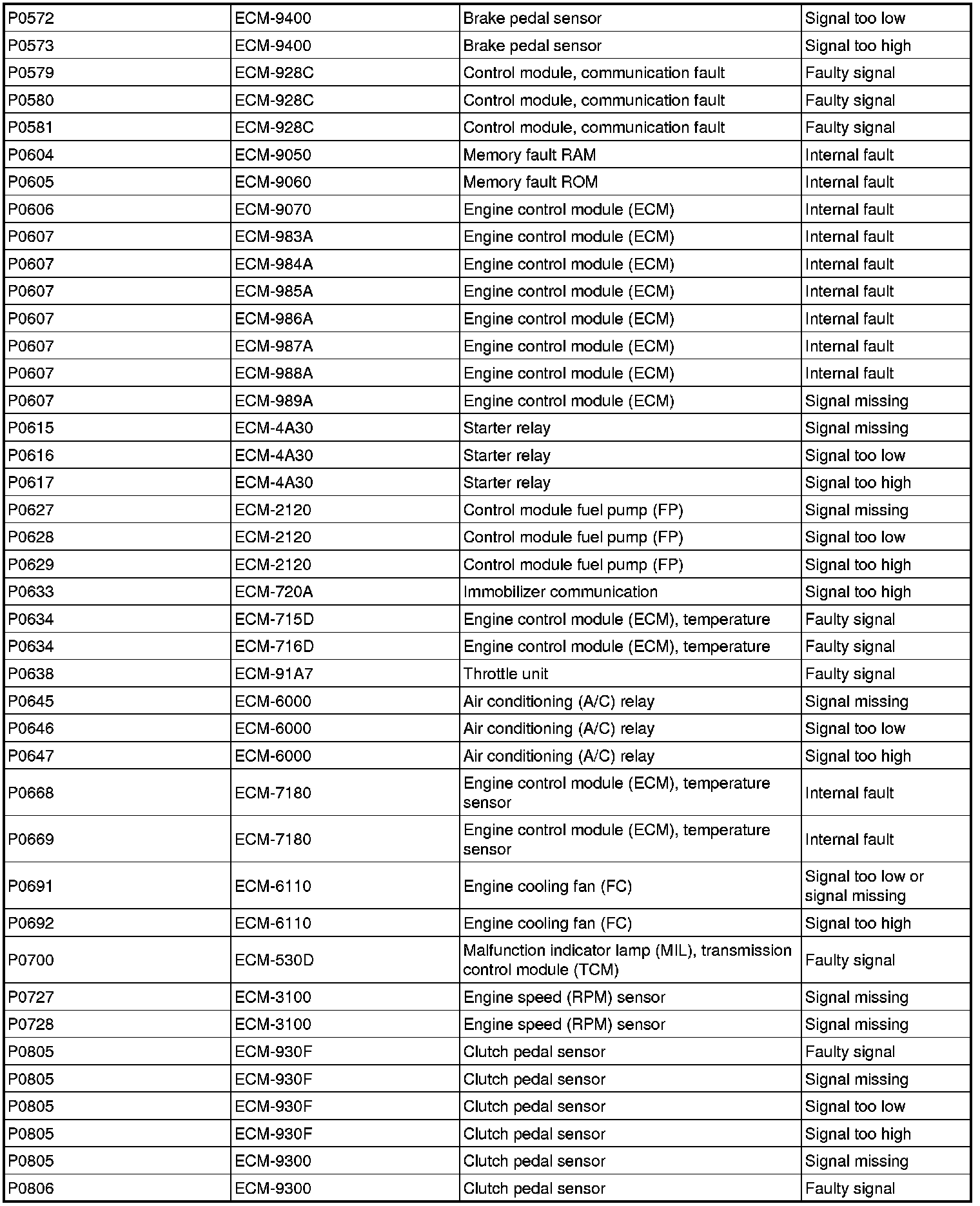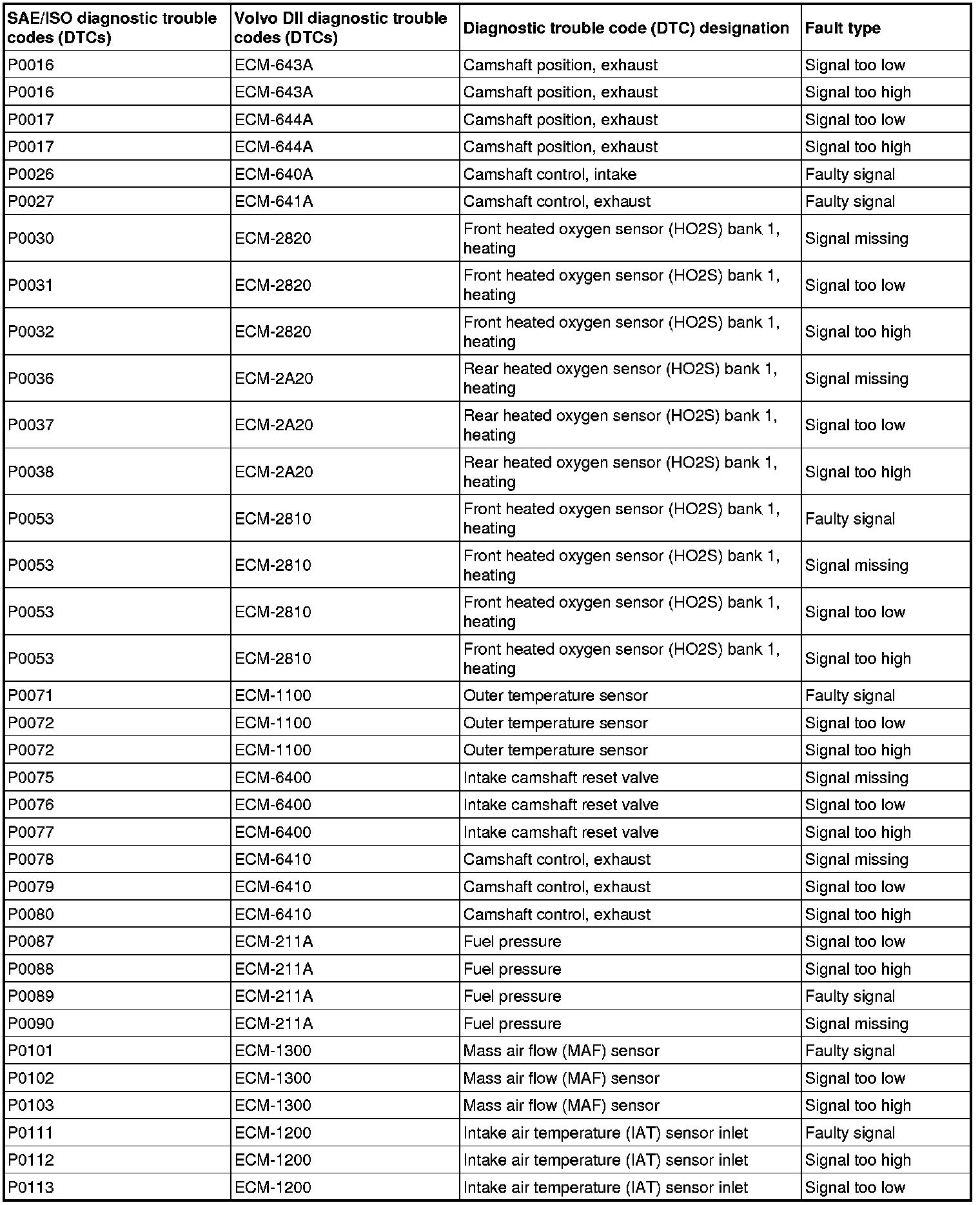 The table below is a conversion table between standardized diagnostic trouble codes (DTCs) (SAE/ISO) and the equivalent Volvo diagnostic trouble codes (DTCs) (DII).