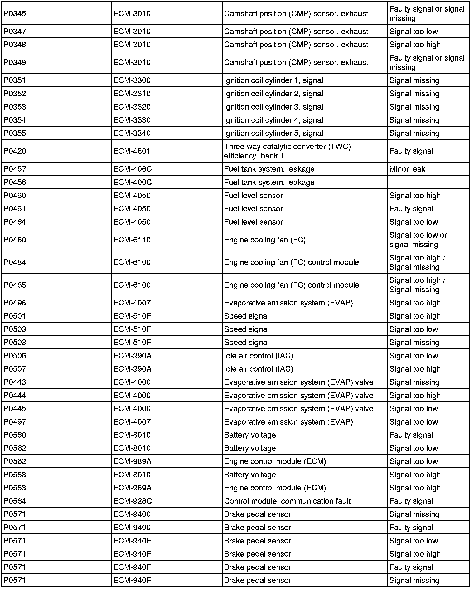 DTC Table (P Codes / ECM Codes) (Part 3):