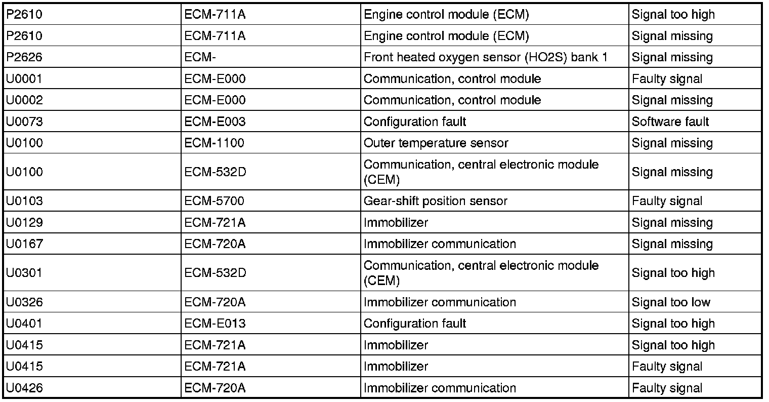 Note! An SAE/ISO diagnostic trouble code (DTC) can correspond to several DII diagnostic trouble codes (DTCs). All of these must therefore by rectified in order for the corresponding SAE/ISO diagnostic trouble code (DTC) to disappear.Several SAE/ISO diagnostic trouble codes (DTCs) may also refer to the same DII diagnostic trouble code (DTC).There are DII diagnostic trouble codes (DTCs) for non emissions-related faults that do not correspond to any SAE/ISO diagnostic trouble code (DTC).
